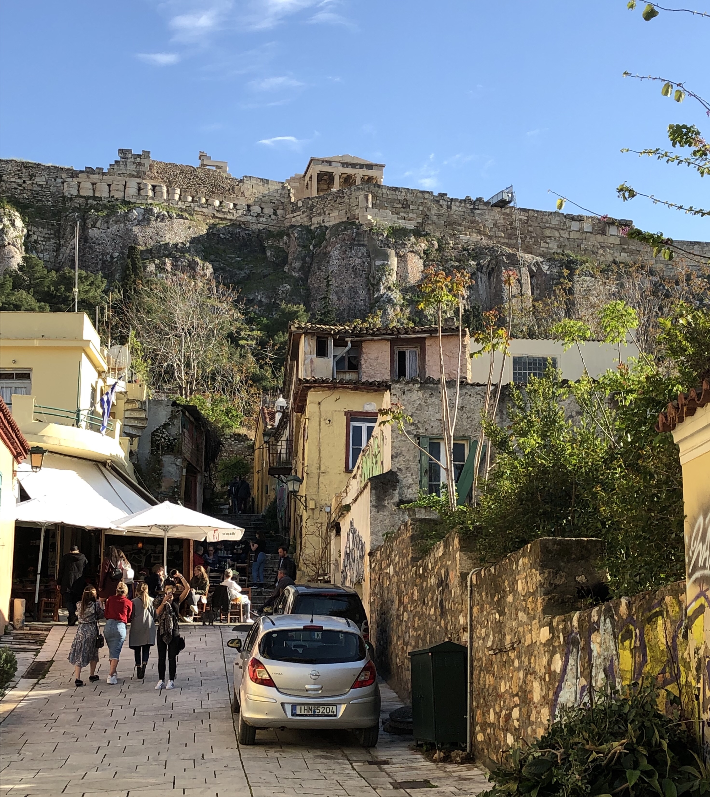 We had saved our tour of the Acropolis till today in hopes of better weather. We were not disappointed as we had a warm, sunny day. The walk up to the ruins took us through beautiful ancient streets. The orange trees give off a heavenly scent in the morning.
