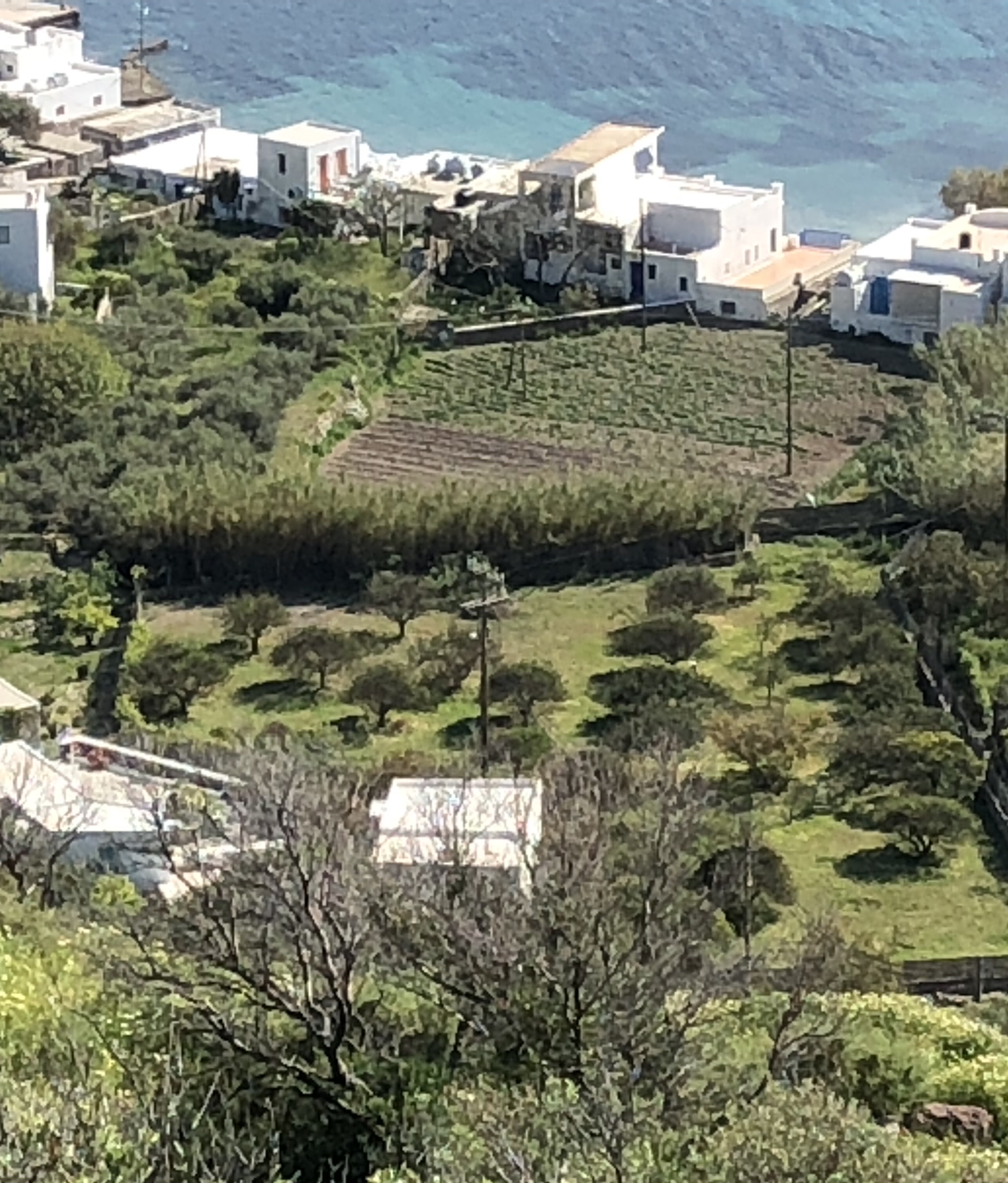 The island gets no rain from June to September in yet. the island produces large amounts of grapes for their wine production. We saw plots of grapes everywhere. The secret we discovered is how they grow the grapes. In the fall at pruning time the vines are woven into what looks like a basket low to the ground. In the spring/summer the leaves grow up and over the woven basket forming an umbrella for the grapes. This protects them from the sun, heat and dust. They are totally dependent on humidity and dew for water and this system gives the plants the most use of the moisture available.