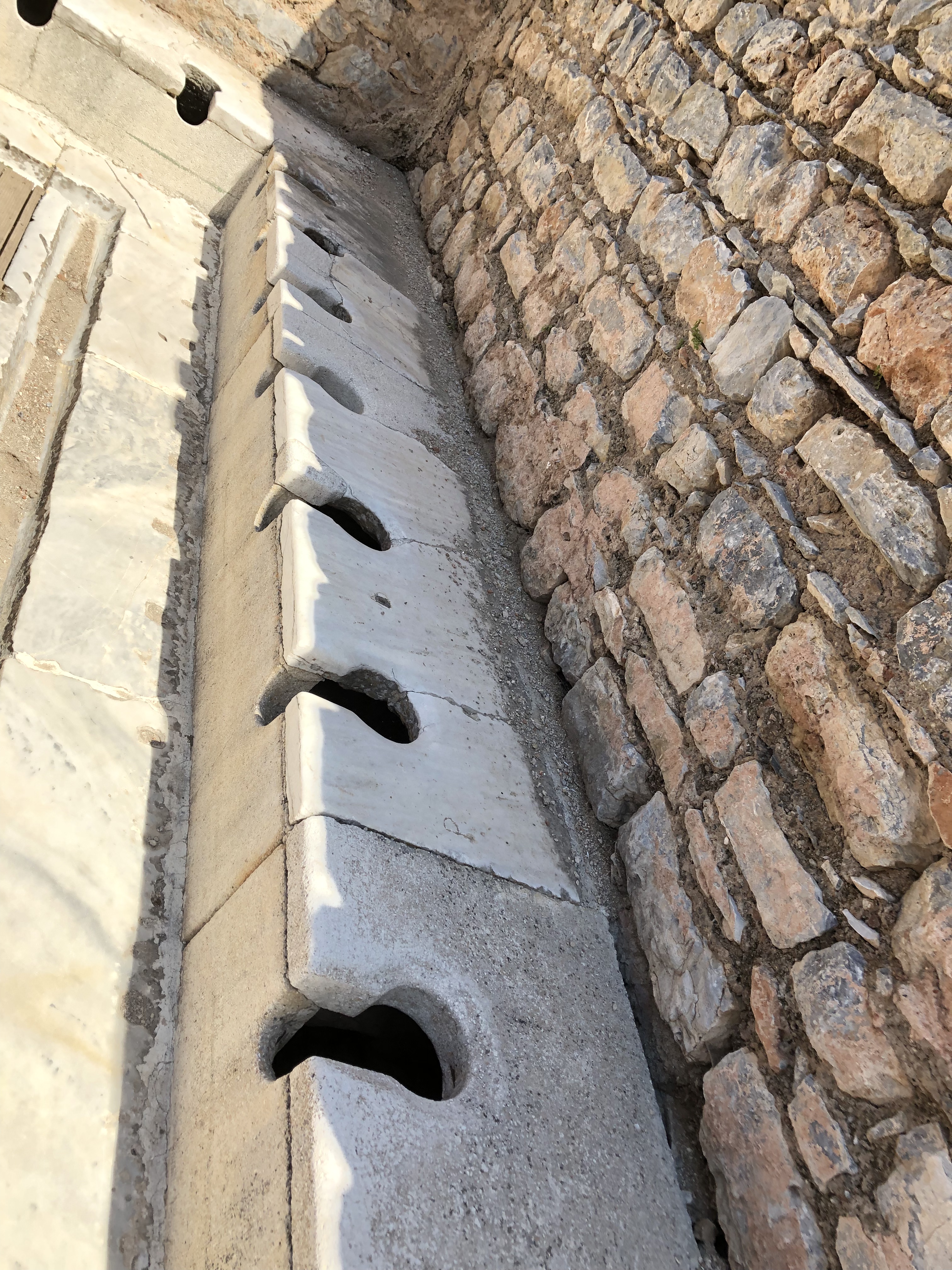 Toilets were a public activity. The water from the baths ran under the seats. The privileged got the seats at the top and the poor got the last of seats at the bottom as the water would be very stinky by the time it reached the bottom. The seats are made of marble, the most important people had slaves that would sit on the seat first to warm the marble for them.