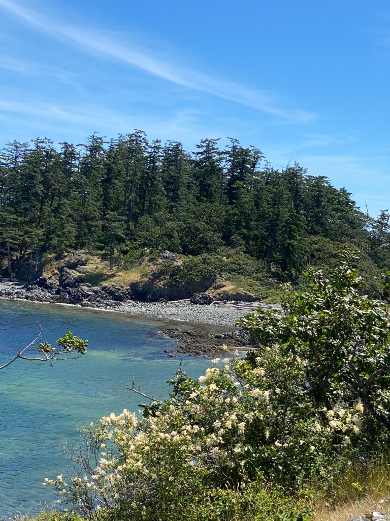 This afternoon the fog lifted and the blue sky appeared for a brief time. Note to self, always bring a camera when walking, we missed capturing a juvenile eagle perched on driftwood on the beach with its wings spread out to dry after fishing in the ocean. Peter went back with said camera but the young eagle was now in a tree, he got a photo but not what we would have had. Lots of walking and exploring of the grounds.